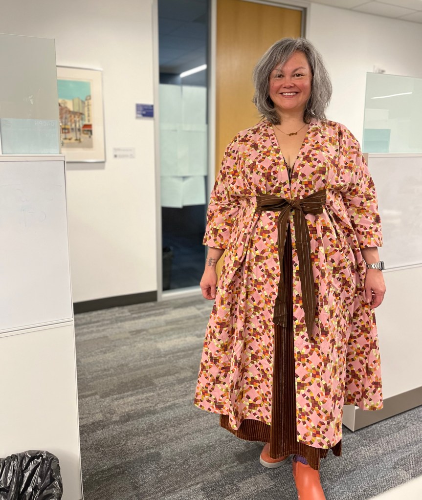I say this because it’s another cold day, and another layering moment. I put together pieces that felt good to me, particularly in these colors. I’m wearing a secondhand velvetyish brown dress that’s nice and stretchy. Over it, I put on this gorgeous Rujuta Sheth wrap dress – one of the last new clothing purchases I’ll be making for a while. The dress is so lovely, and I love the bold print in these soft colors. But now that I look at my ootd photo, was wondering if maybe wearing it as a duster to the office all day, just to be covered up by a coat again does it a disservice. I suppose I’ll just have to take it out and show it off on its own in warmer weather!